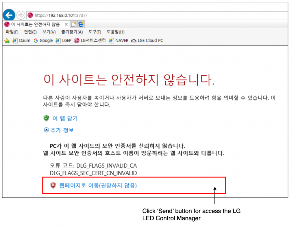- Access https://192.168.0.101:3737 to setup the LG LED Control Manager of LCLG006